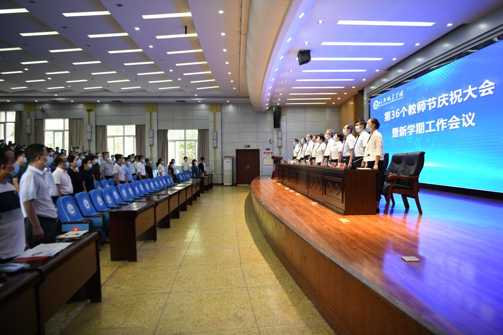 (通讯员 许京生)为表彰在教育教学工作中涌现出的先进个人,营造尊师重教的良好氛围,进一步激发广大教师的使命担当,9月10日上午,我校在行政楼学术报告厅召开第36个教师节庆祝大会暨新学期工作会议。校领导张惠贞、王召东、许朝民、王靖、贺国营、杨风岭、刘守勇、宿金勇、周颖杰、吴晓红、陈松涛出席大会并为受表彰的先进个人颁奖。学校副科级以上干部、受表彰优秀个人等400余人参加会议。会议由党委副书记、工会主席许朝民主持。