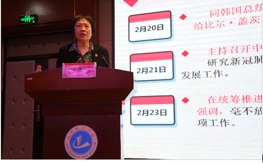 张惠贞围绕“抗击疫情回顾、疫情防控中的切身感受、疫情防控给我们的启示”等三个方面,以习近平总书记指挥防疫工作日志为引线,从总书记关心全国医务人员的健康、回信勉励北京大学援鄂医疗队等重要方面作为切入点,结合自身工作经历与切身感受,深刻分析了中国共产党的坚强领导与抗疫斗争中所彰显的中国特色社会主义制度巨大优越性。同时,围绕“党的全面领导是取得全国抗疫斗争重大战略成果的根本原因”这一核心话题,通过分享渐冻生命与死神竞速的张定宇、年过七旬仍坚守在抗疫一线的老党员以及牺牲节假日保障学校安全有序的学校各部门老师等生动鲜活的事例,引导同学们深切体会到了党员先锋模范带头作用是全民战疫中的中流砥柱,党紧紧依靠人民是战疫致胜的不二法宝。张惠贞强调,中国特色社会主义制度优越性所体现出的超强的组织动员能力、高效的组织协调能力、核心价值的引领能力、强大民族凝聚能力是战胜疫情的根本保证。同时,中国疫情防控成功经验和为其他国家提供技术支持和物资援助,向全世界人民生动展示了中国负责任形象与构建人类命运共同体的大国担当。