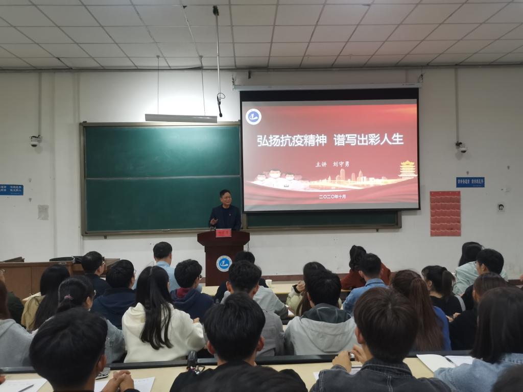 刘守勇围绕“伟大抗疫精神、对大学生的启示、出彩人生需要具备的品质、如何谱写出彩人生”四个方面内容,通过钟南山、张伯礼等抗疫英雄的鲜活事迹和客观的抗疫数据,结合自身经历,向在座师生详细阐述了“生命至上、举国同心、舍生忘死、尊重科学、命运与共”的伟大抗疫精神,教育引导同学们深入理解精神内涵,提升人生境界,勇担责任使命。最后,他强调,期望同学们能够坚定理想信念,努力学习提升,自觉把奋进的脚步与国家发展的脉搏、民族复兴的进程同频共振,把自身成长的根基打得更牢、扎得更深,奋力谱写出彩人生。