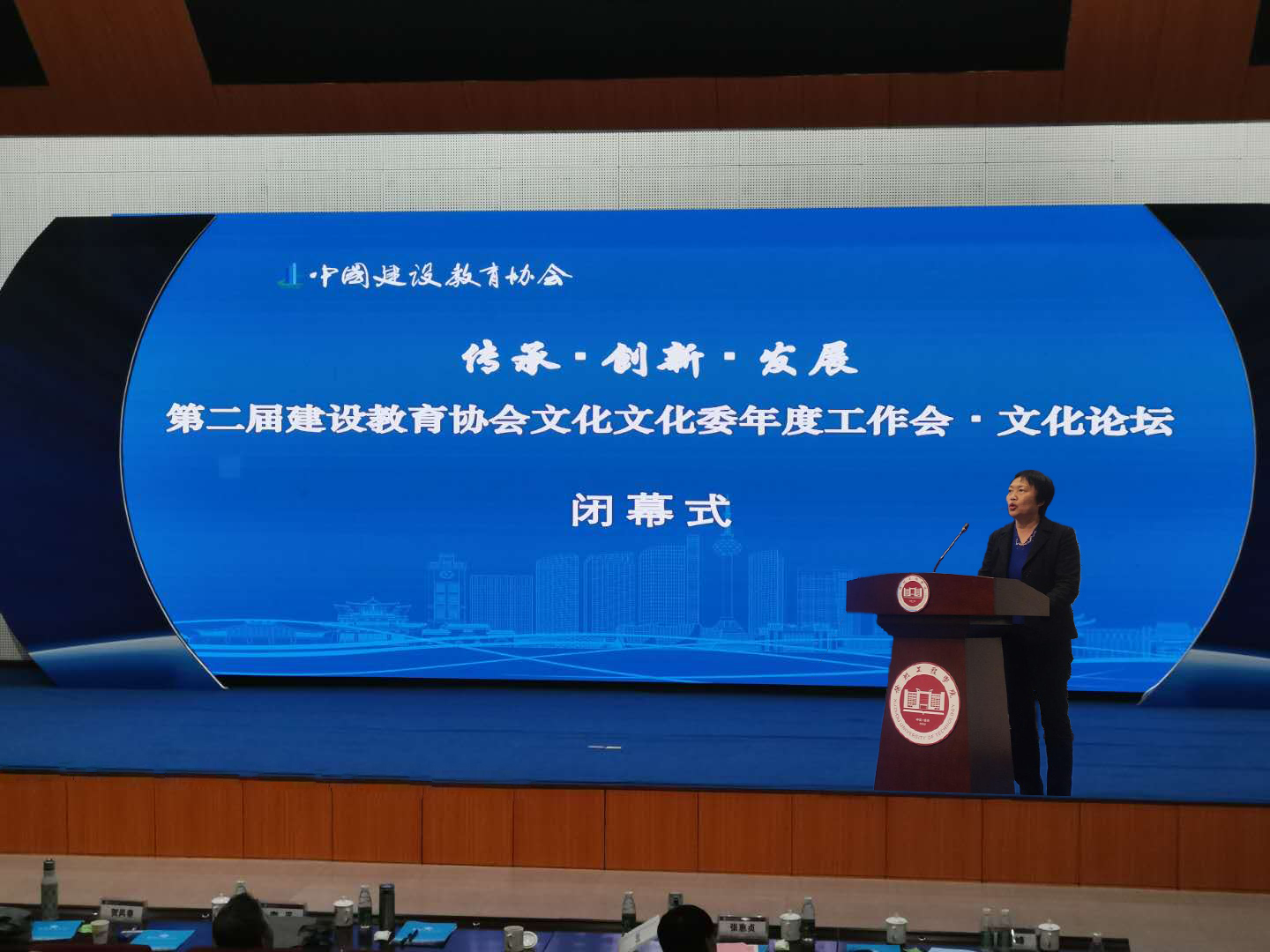 论坛闭幕式上,我校党委书记张惠贞代表文化工作委员会作总结讲话。张惠贞指出,本次论坛时间虽短,但主题鲜明,内容丰富,收获颇丰。总结起来,有以下几个特点:一是论坛意义重大。建设行业文化建设,不仅关系到人才培养质量的提升,关系到企业健康成长,关系到服务建设行业和经济社会的发展,更是贯彻落实习近平总书记关于坚定文化自信、建设社会主义文化强国精神的实际行动,是推动中华优秀传统文化创造性转化、创新性发展,不断铸就中华文化新辉煌具体举措,是对中国建筑文化、文明的传承和弘扬。二是论坛精彩纷呈。本次论坛上邀请到7位专家作主题报告,7家单位作大会交流发言,与会专家学者们从地域建筑文化的发掘与传承、古代建筑文化的追溯与弘扬、建筑行业企业文化的培育与彰显等多重维度为我们带来精彩观点。同时,本届论坛通过“筑梦新时代”微视频大赛、“筑之物语”摄影作品大赛以及论文征集等丰富了活动形式、提高了社会关注度、扩大了行业影响力。三是论坛成果丰富。本次论坛共收到论文63篇,其中学术类54篇,其他类9篇,论坛组委会对论文进行了认真整理,并组织专家进行评审,最终确定特等奖1项,一等奖2项,二等奖5项,三等奖10项,编辑形成了《第二届建设行业文化论坛征文活动作品集萃》,既是建设行业文化建设成果的一次集中展示,也对传承建筑文化渊源和精湛建筑工艺,以及今后的建设行业文化建设工作具有很强的针对性和指导性。四是评选出建设行业文化建设示范单位。该活动通过在全国建设行业界树立典范和学习榜样,必将有力推进建筑文化创新,增强企事业的核心竞争力,推动协会文化工作更好更快开展。张惠贞指出,我们要以这次文化论坛为契机,深入贯彻落实党的十九大精神,以习近平新时代中国特色社会主义思想为指导,准确把握建设行业文化建设正确方向,坚定文化自信,增强文化自觉。坚持用社会主义核心价值观引领建设行业文化建设,为行业发展提供精神动力和文化支撑,为推进中国工程建设行业文化建设作出新的更大贡献。