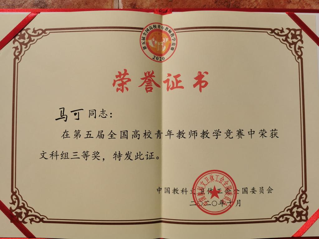 (通讯员 马可 文枫)近日,由中国教科文卫体工会全国委员会举办、江苏省教育科技工会与南京大学承办的第五届全国高校青年教师教学竞赛在南京举行。经过省内层层选拔,我校教师马可作为河南代表队唯一一名文科选手参赛,历经数月准备,多次打磨,反复演练,最终在决赛环节获得全国文科组三等奖的好成绩。比赛中他以精湛娴熟的教学技艺、颇具深度的教学反思,展现了河南城建学院教师的风采和教学水平。本次获奖,也是我校教师首次在全国青年教师教学竞赛中获奖。