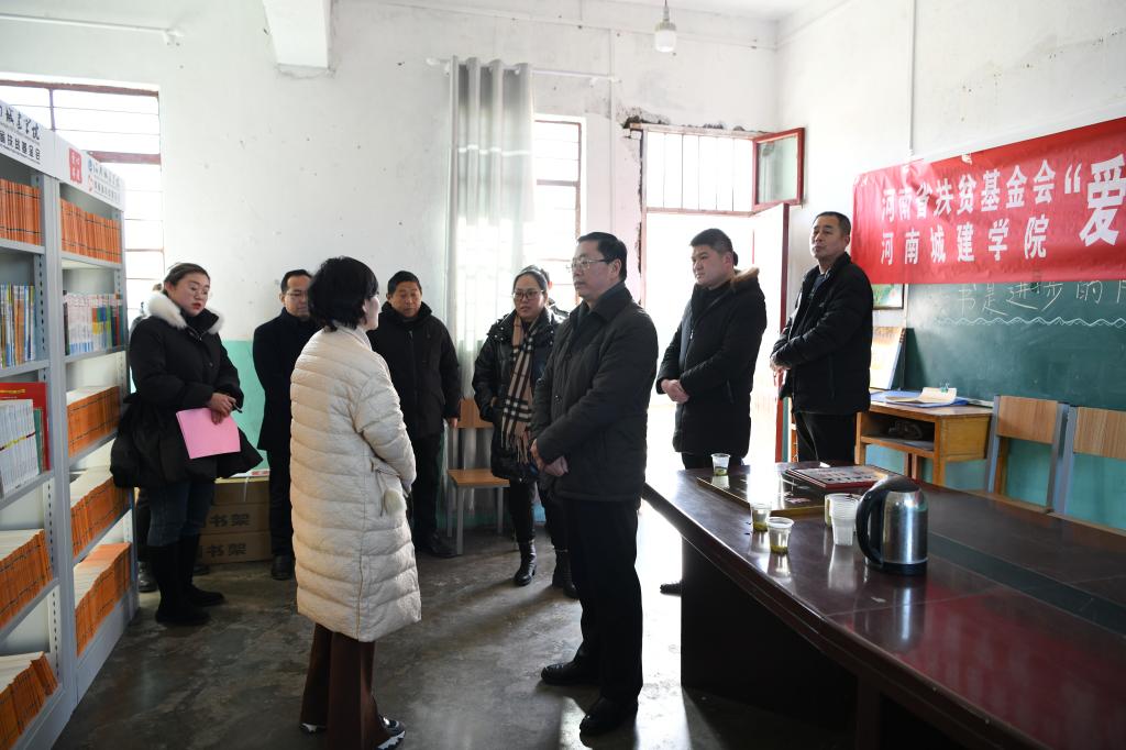 许朝民与参加仪式的人员一起参观了“爱心书屋”的建设情况,并代表学校向河南省扶贫基金会的大力支持表示感谢,向长期致力于农村教育事业的老师们传达了学校党委的关怀和慰问。他表示,近几年来,我校与搬走岭村、新庄村和鲁山县共谋扶贫事业,在智力扶贫、教育扶贫上取得了显著成绩,为脱贫攻坚工作和地方经济社会发展贡献了城建智慧、城建力量,得到了广泛认可。2020年6月,为深入贯彻习近平总书记关于扶贫工作的重要论述,助力教育脱贫,切实保障贫困家庭孩子充分接受教育和阅读的权利,在省扶贫基金会的指导下,我校全体教职工积极响应募捐号召,踊跃捐款,不到10天的时间里累计捐款达5万余元,并由省扶贫基金会积极筹措,补齐2个“爱心书屋”所需的6万元建设经费,为库区二小和新庄村小学送来了广大教职工和社会各界的爱心。他指出,2021年既是“十四五”开局之年,又是开启乡村振兴新篇章之年,“爱心书屋”的顺利落成为我校持续推进教育帮扶、智力帮扶提供了有力保障,为少年儿童学习教育贡献了一份力量。今后,河南城建学院将会继续坚决贯彻省委省政府、市委市政府决策部署,抗稳帮扶责任,发挥教育优势,巩固脱贫成效,积极推进乡村振兴各项工作。