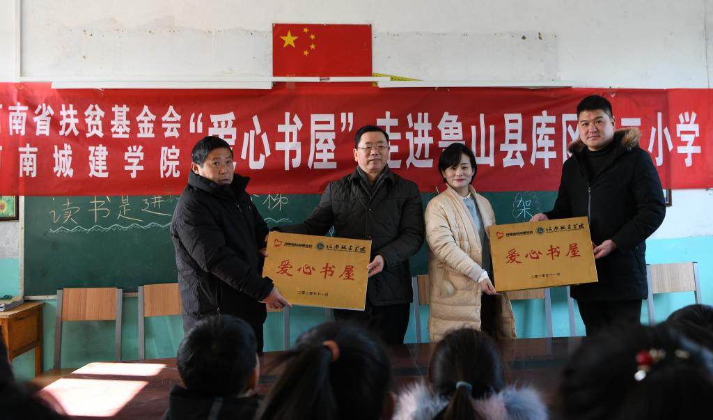 (通讯员 舒雪冬 程鹏)1月7日,我校与河南省扶贫基金会“爱心书屋”公益活动捐赠仪式在鲁山县库区乡搬走岭村举行,党委副书记、工会主席许朝民出席仪式并讲话。河南省扶贫基金会部门负责人王品主任和我校党委组织部负责同志、搬走岭和新庄驻村第一书记、库区乡第二小学校长段亚超、尧山镇新庄小学校长张志峰及20余名小学生参加了活动仪式。