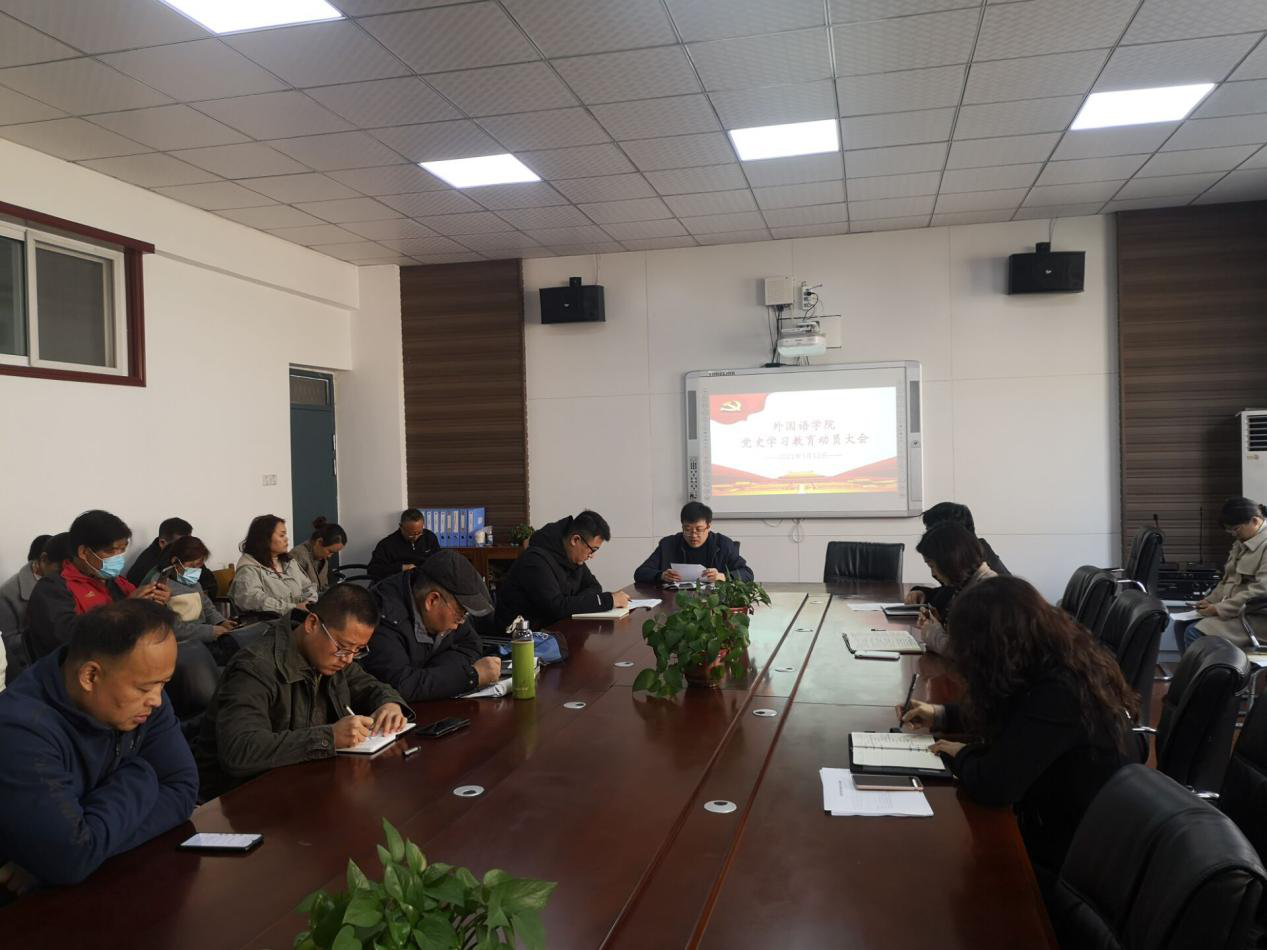 (通讯员 王莉)3月12日下午,外国语学院在学院会议室召开党史学习教育动员大会,会议由院党委书记王东旭主持,副院长张换成,党委副书记胡思博,副院长秦小锋,副院长张凤琴和全体教师参加会议。