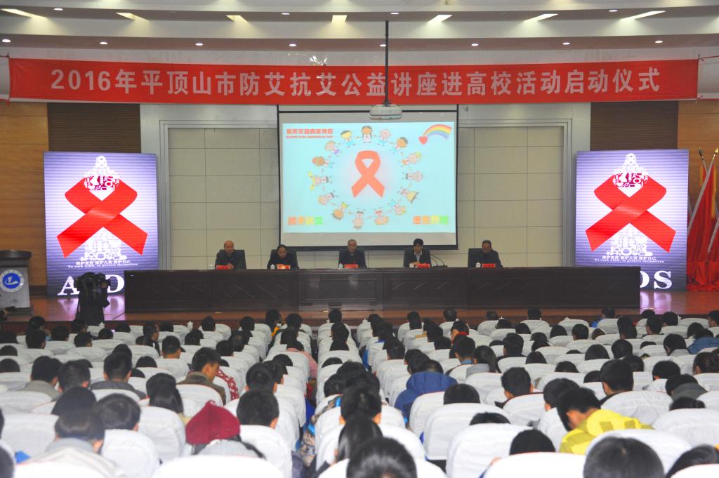 (通讯员 范惠萍)11月29日下午,在第29个世界艾滋病日来临前夕,由平顶山市人民政府主办、市政府艾滋病防治工作委员会办公室、市卫生计生委、市疾病预防控制中心和我校共同承办的2016年平顶山市防艾公益讲座进高校活动启动仪式在我校行政楼学术报告厅举行。我校党委副书记张坤书,河南省疾病预防控制中心艾滋病防治研究所所长朱谦,平顶山市政府副秘书长郭栓谨、艾防办主任、卫生计生委副主任杨振民、疾病预防控制中心主任李智伟以及我校相关单位负责人和400余名师生共同参加本次活动。