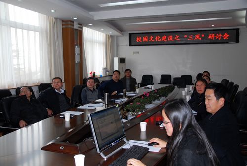 11月24日上午、25号下午,我校在第一会议室召开校园文化建设之“三风”研讨会。学校党委副书记王召东出席会议。会议由宣传部长闫中华主持,学校从事语言文字工作的相关领导、教师和校园文化建设组织文化组的成员参加会议。