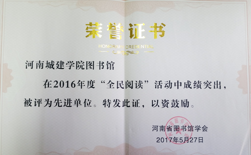 (通讯员 魏现辉)近日,在由河南省图书馆学会举办的2016年度全民阅读先进单位评选活动中,我校图书馆被授予“河南省全民阅读先进单位”荣誉称号。
