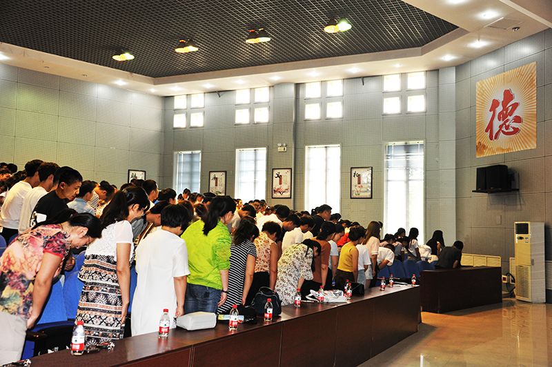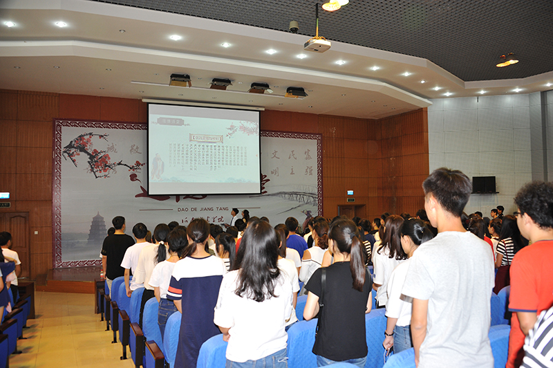 全体师生在用心感悟传统道德经典中起立向“德”字鞠躬行礼。