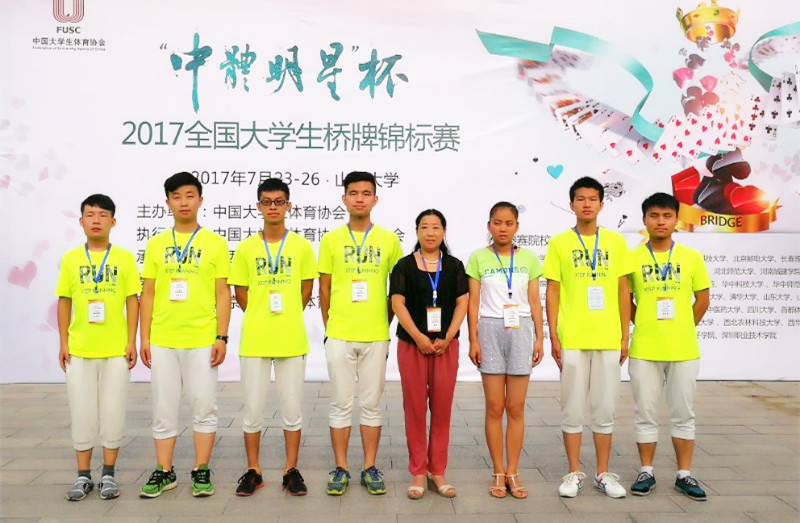 (通讯员 王智勇)近日,“中体明星”杯2017年全国大学生桥牌锦标赛在山西大学举行,共有来自清华大学、北京大学、上海交通大学、复旦大学等全国51所高校的80支代表队,530余名运动员、教练员参加比赛。我校以体育教学部主任常静为领队,教师李冰冰、王建岭为教练,学生党焕楠、李森、刘兴瑞、杨双龙、黄震、赵志育等6名队员组成的代表队参加了比赛。经过4天的激烈角逐,我校选手党焕楠、李森获得公开甲级双人赛东西方向冠军,创造了我校大学生参加全国桥牌赛事的最好成绩,为我校赢得了荣誉。