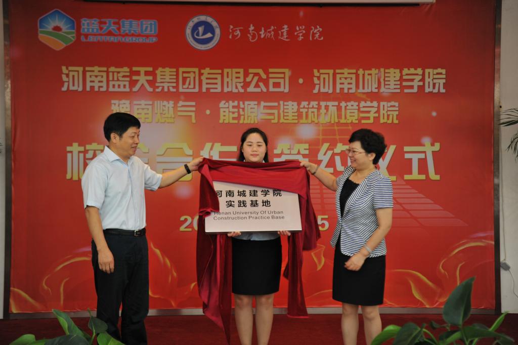 会上,王靖、彭盛楠分别代表河南城建学院、河南蓝天集团有限公司签署合作框架协议,并为河南城建学院实践基地揭牌;能源与建筑环境工程学院院长马良涛和李三星分别代表河南城建学院能源与建筑环境工程学院、豫南燃气股份有限公司签订科技服务协议。