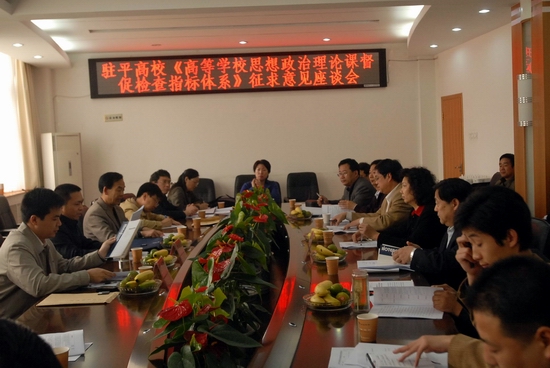 4月24日上午,受省教育厅社政处的委托,驻平高校《高等学校思想政治理论课督促检查指标体系》征求意见座谈会在我院召开。省教育厅社政处处长王亚洲主持座谈会。会议期间,院党委书记李德平、院长孔留安看望了王亚洲一行。院党委副书记张莉蓉出席座谈会,院党委宣传部、人事处、教务处、财务处、科研处、思想政治教育教学部负责人及平顶山学院、平顶山工业职业技术学院、平顶山质量工程学院思想政治理论课有关负责同志参加了座谈会。