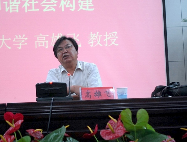 高雄飞教授旁征博引、纵贯古今、横跨东西,以其高深的理论基础、丰富的社会知识、独特的视角和妙趣横生的语言,精辟透彻地论证了加强党的执政能力建设与和谐社会建设的关系。他指出,构建社会主义和谐社会,是巩固党执政的社会基础的必然要求;是党坚持立党为公、执政为民的必然要求;是党实现好、维护好、发展好最广大人民的根本利益的重要体现;是党实现执政历史任务的重要条件。提高构建社会主义和谐社会的能力是加强党的执政能力建设的重要内容。在错综复杂的国内国际形势下,党只有解放思想、与时俱进,分析新情况,研究新问题,总结新经验,发展新思路,采取新举措,制定新制度,不断地创新党建工作,才能进一步提高执政能力,应付复杂多变的执政局面,接受新形势新任务的严峻挑战,带领全国各族人民实现社会主义和谐的宏伟目标,切实代表好、维护好中国最广大人民的根本利益。