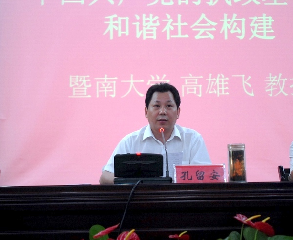 8月9日上午,中国社会科学研究会理事、暨南大学教授高雄飞应邀到我院围绕《加强党的执政能力与和谐社会建设》作大讨论活动专题讲座。讲座在西校区学术报告厅举行,院领导及全院科级以上干部现场聆听。报告会由院长、党委副书记孔留安主持。