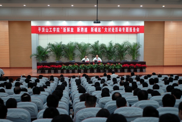 8月8日上午,我院召开“新解放、新跨越、新崛起”大讨论活动专题报告会。平顶山市委书记赵顷霖同志应邀到我院作专题报告,希望我院借开展解放思想大讨论活动的契机,进一步解放思想,更新观念,开阔视野,拉高标杆,不断提升办学层次和办学质量,努力办成特色优势突出、充满创新活力的品牌高校。会议由院大讨论活动领导小组组长、党委书记李德平同志主持。院大讨论活动领导小组副组长、院长孔留安、党委副书记、纪委书记张莉蓉、党委副书记史战芳,领导小组成员、副院长王召东、副院长陈丙义、副院长杨留栓、工会主席张坤书出席报告会,全院500名科级以上党员干部、教授、博士、辅导员和教职工代表参加了报告会。