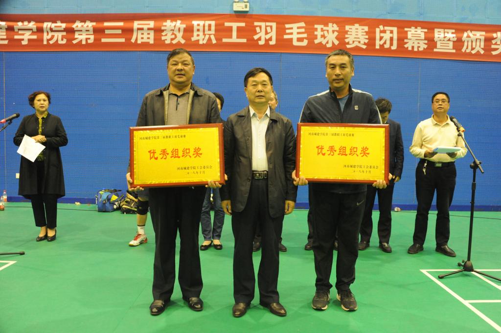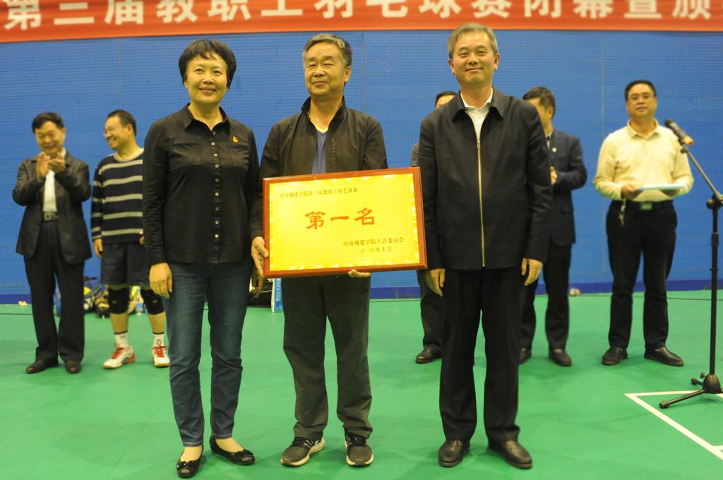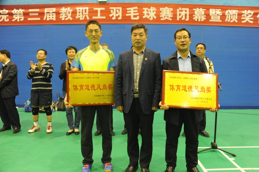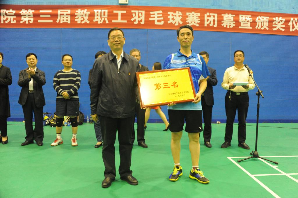 (通讯员 文枫)10月30日下午,由校工会主办、体育教学部承办的我校第三届教职工羽毛球赛完成了预定的各项赛程,在校体育馆举行闭幕式。校领导张惠贞、王召东、杨留栓、许朝民、梁再培、周新峰出席仪式并为获奖单位和选手颁奖。闭幕式由校工会副主席闫中华主持。