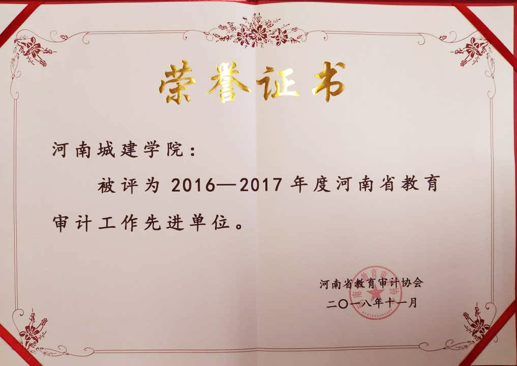 (通讯员 胡云鹏)近日,河南省教育审计协会下发了《关于表彰教育系统内部审计工作先进单位和先进工作者的决定》(豫教审协[2018]8号),公布了河南省教育审计工作先进单位和先进工作者名单。我校荣获2016-2017年度“河南省教育审计工作先进单位”称号;马照民、张晓丽和胡云鹏3位同志被授予“河南省教育审计工作先进工作者”荣誉称号。