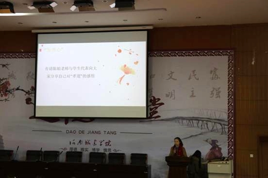 本期道德讲堂以“永言孝思,思孝惟则”为主题,共分为省自身、唱歌曲、学模范、诵经典、谈感悟和送吉祥六个环节。在省自身环节,主持人以《孝经·圣至章》中的经典词句“天地之性,惟人为贵。人之行,莫大于孝。”拉开了帷幕,以“今天我们是否关心了自己的父母?我们是否用心对待了自己的亲人?我们是否做到了儿女应尽的孝道?”三问让大家反躬自省;在唱歌曲环节,全体师生肃然站立,心怀孝道,在手语舞者的引领下,齐声高唱《感恩的心》;在学模范环节,大家一起观看了入选2018年10月中国好人榜的22岁善良女孩——殷自玉的感人事迹。殷自玉的父亲早年因癌症去世,母亲因患先天性软骨病无法站立,从四岁开始,殷自玉就用弱小的肩膀扛起家庭重担,6400多个日夜,悉心照顾瘫痪母亲,面对贫困和艰难,任劳任怨,坚守善良,乐观向上。出嫁时,她坚持带着母亲嫁人,用自己的行动诠释着孝老爱亲的真谛;在诵经典环节,外国语学院院长秦平新带领全体师生共同诵读《弟子规》之“入则孝”章节;在谈感悟环节,外国语学院陈娟老师和2名学生代表以自身的经历分享了对孝道的感悟;在送吉祥环节,外国语学院党总支书记袁晓、院长秦平新为全体师生送上了具有学院特色且富含孝道能量的精美书签。