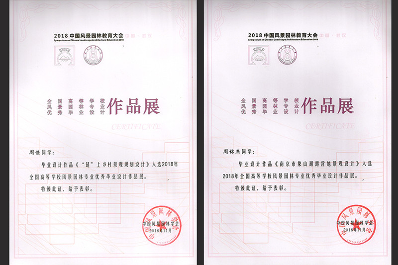 我校建筑与城市规划学院周勃、李璐斐老师指导,2018届风景园林专业周佳同学的《“链”上乡村景观规划设计》和周铭杰同学的《南京市象山湖露营地景观设计》作品入选2018年全国高等学校风景园林专业优秀毕业设计作品展。作品展示了我校学生关注建设美丽中国、实施乡村振兴战略、推进生态文明建设对风景园林人提出的新要求、新挑战,凝聚了我校学子“提升人居环境,建设美好家园”的理想与智慧。