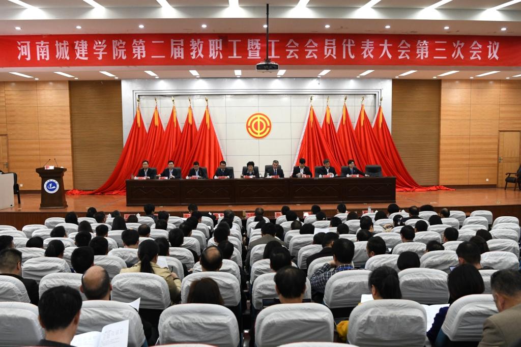 (通讯员 腾飞)3月19日下午,在庄严的《中华人民共和国国歌》声中,河南城建学院第二届教职工暨工会会员代表大会第三次会议在行政楼校学术报告厅开幕。校领导张惠贞、王召东、杨留栓、张坤书、许朝民、赵金安、梁再培、王靖、刘守勇出席大会。正式代表、列席代表参加开幕式。会议分两阶段进行,分别由校党委书记张惠贞,党委副书记、工会主席许朝民主持。