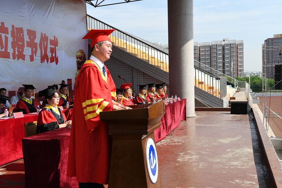 王召东还同广大毕业生分享了全国雕塑企业工作委员会主任、与我校开展产教融合合作的雕塑家张宝贵,中国首位获得“普利兹克”奖的建筑师王澍,我校生命科学与工程学院2011届毕业生、现在上海交通大学医学院博士后流动站从事研究工作的唐超的优秀事迹。同时提出了殷切的期望和叮嘱:一是心怀家国方能奋斗出彩。希望同学们珍惜韶华、勤奋努力,用实际行动为祖国建设添砖加瓦。二是勇于创新方能传承发展。希望同学们勇于探索,善于总结,在传承中创新,在创新中发展,不断开辟事业和人生的新境界。三是砥砺奋斗方能勇立潮头。希望同学们牢记习近平总书记嘱托和期望,做青春追梦人,做时代追梦人,践行厚德博学、知行合一,创造出属于自己、母校和祖国的成就和辉煌。