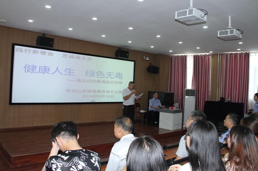 (通讯员 常建忠)6月18日下午,我校在5号教学楼C座214音乐教室举办了“健康人生•绿色无毒”毒品预防教育知识讲座,邀请平顶山市禁毒委员会办公室王军辉警官来校讲座。平顶山市禁毒委员办公室副主任崔会杰、学生处、保卫处相关人员、各学院学生代表200余人聆听了此次讲座。讲座由保卫处处长侯占营主持。