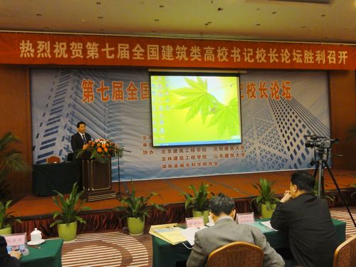 全国建筑类高校书记校长论坛是由中国建设教育协会主办、多所建筑高校协办的国内较高规格的建筑人才专业性论坛,每年一届,今年是第七届。本届论坛的主题是“以全面提升办学质量为核心,努力实现‘十二五’期间建筑类高校的科学发展”。国家住建部、中国建设教育协会、湖南省住建厅、湖南省教育厅、益阳市委等有关部门领导,来自全国各地10余所建筑类高校书记、校长(院长)及有关高校土木、建筑院(系)的代表参加了论坛。论坛围绕主题,开展了深入交流和研讨,总结分享了各高校建设发展的成功经验,分析了建筑类高校建设发展面临的机遇和挑战,提出了“十二五”期间建筑类高校如何科学发展的建议。