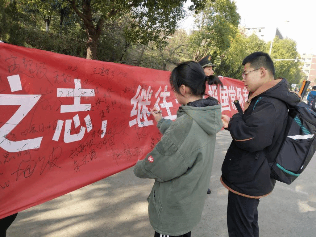 当天,我校国旗护卫队在中心文化广场举办“缅怀一二·九,弘扬民族魂”的签名活动。500余名学生在“高举一二·九火炬,传承青春活力,弘扬唯实博学,展现城建风采”和“发奋图强成才不负青云之志,继往开来报国常怀赤子之心”宣传条幅上签名明志。