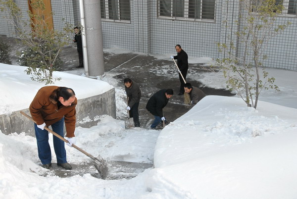 随着张法成主任的一声号召,大家挥锨舞帚,破冰除雪,表现出了可贵的主人翁意识。经过大家辛勤紧张的劳动,行政楼前后露出了干净的道路,特别是学术报告厅门前的台阶也被打扫得干干净净,方便了大家的出行。