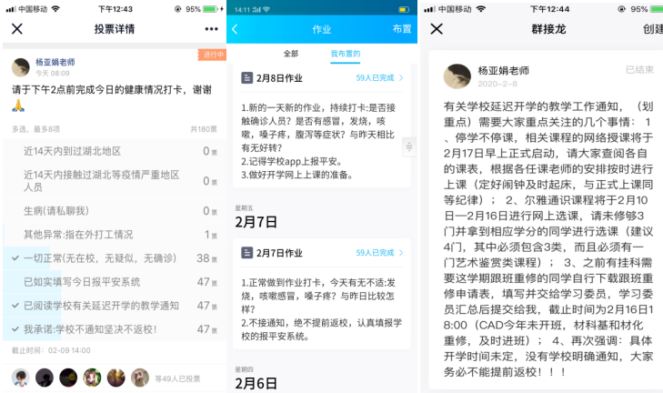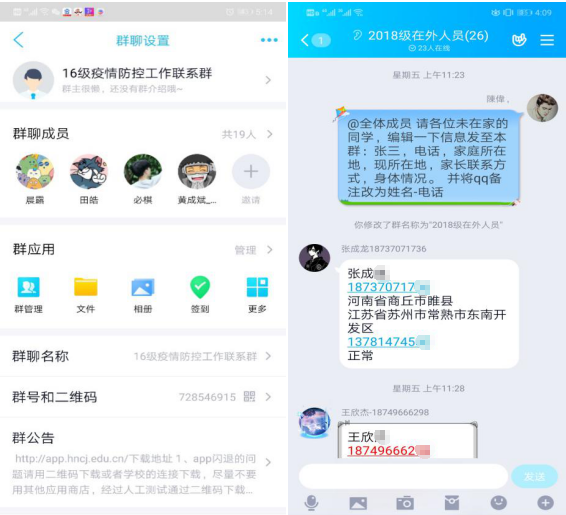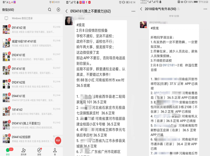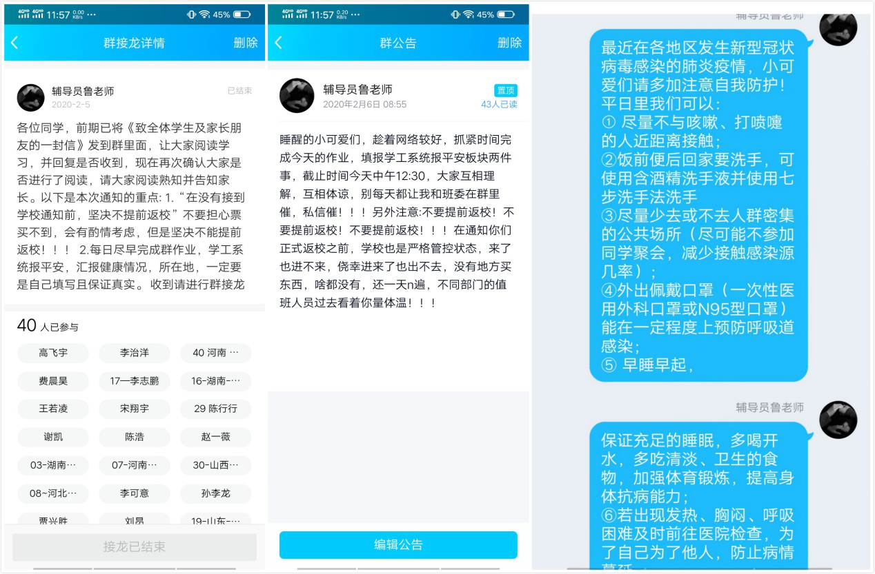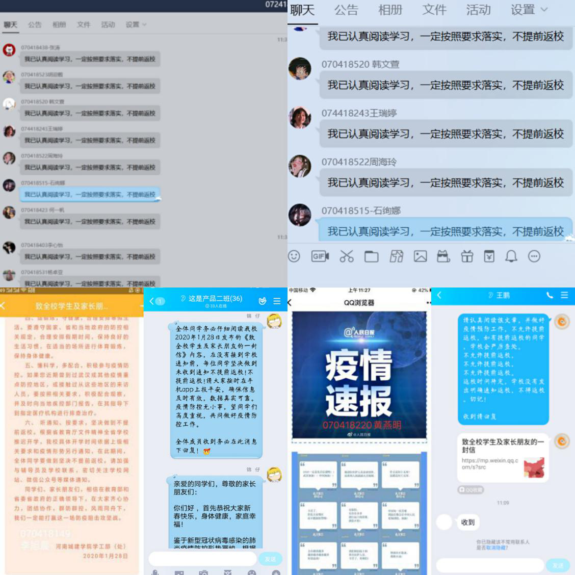 电气与控制工程学院要求疫情防控期间在充分发挥学生干部和党员的作用的同时,各辅导员必须深入到班级中,发现异常及时一对一沟通,对各项通知务必保证每一位学生都收到,并实施反馈制。学生群里以接龙方式对学院通知、每日将健康状况报备进行上报,实行学院学校双线排查。对重要通知放在接龙题头,每一位同学接龙时阅读一遍,一次次加强传播力度。同时学院要求辅导员每天汇报其排查情况,排查人数,学院党总支指导辅导员科学有效开展工作,同时督促辅导员把工作做实做细,不留死角。实行专事专群,特殊人员分类别管理。针对疫情防控我院辅导员有建立年级疫情防控小组的、有针对在外打工学生建群进行交流。