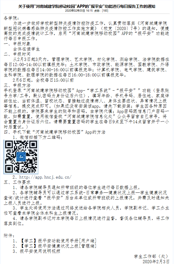 学工部针对广大学生疫情状态信息采集难、汇总统计工作量大的困境,充分利用信息化手段,在河南城建学院移动校园APP上开通了“疫情期间学生健康信息上报”功能,实现学生信息快速统计,全体学生通过登录“河南城建学院移动校园App—学工系统—报平安”系统,可以进行每日健康信息报告,学校每日能够全面、快速、精确采集学生疫情信息,牢牢把好疫情防控的“入口关”。