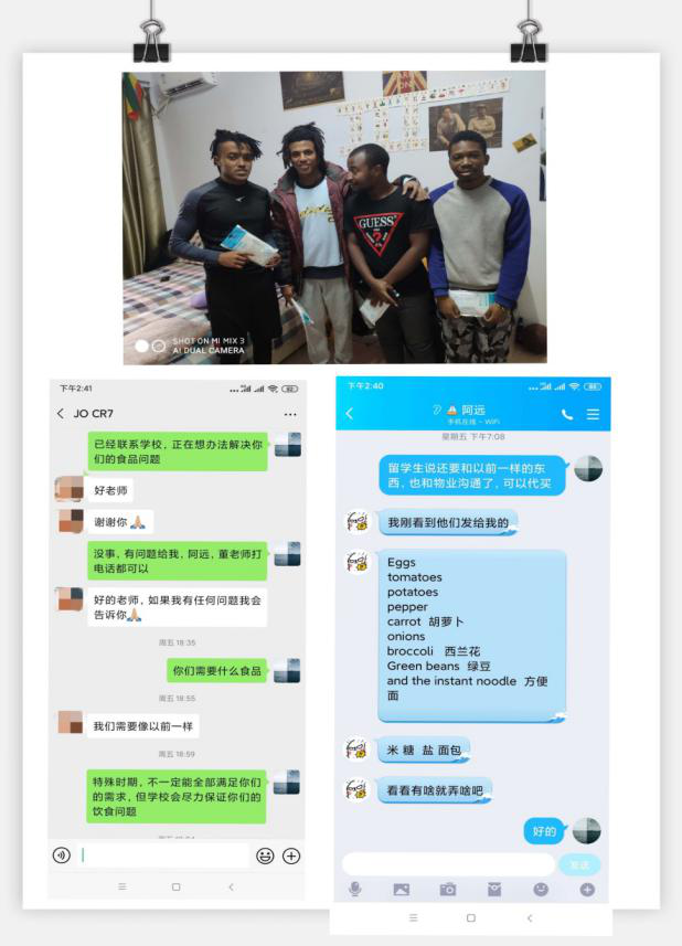 对于疫情防控,学校还给予寒假留校学生特殊关心关爱,国际教育学院辅导员切实了解关心在校留学生的住宿和饮食问题,并为他们送去防控用品,帮助在校学生合理安排假期生活,及时进行心理疏导,引导学生保持积极乐观的心态。