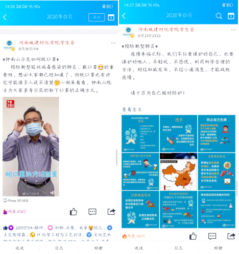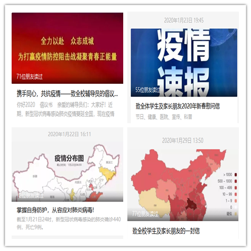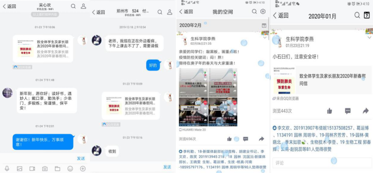艺术设计学院、测绘与城市空间信息学院、生命科学与工程学院通过微信群、QQ、微信或QQ空间等媒体平台,积极向各年级学生开展疫情安全教育、健康教育,宣讲有关疫情防控政策、要求和措施,发布新型冠状病毒感染的肺炎相关科普热点、疫情防控知识、疫情防控战倡议书、致全体学生及学生家长的一封信等,向学生和家长普及疫情防控知识和防控要求,引导师生及家属寒假期间不前往武汉等疫情严重地区及其周边地区进行学习、实践、探亲和旅游等活动,避免与前往武汉等疫情严重地区及其周边地区的人员接触。引导全体学生提升认识,理性对待,科学防控,消除恐慌,不信谣、不传谣,维护良好网络舆论环境,坚决做到不接到通知,坚决不返校,做疫情防控期间最美的人。
