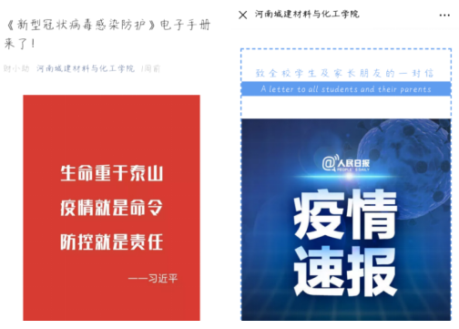 管理学院、市政与环境工程学院、数理学院、法学院等学院建立了四级联动工作机制,确保学生通过“河南城建学院移动校园App—学工系统—报平安”系统,及时填报健康状况信息,全面准确掌握学生情况。辅导员统计核对学生报送相关数据,每天工作至凌晨,做到全覆盖、无遗漏,精准建立疫情防控学生信息台账,每天更新疫情信息。