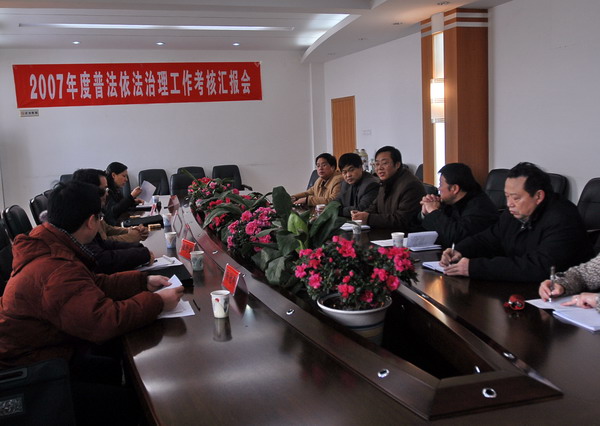 根据平顶山市依法治市办公室年初与我院签订的依法治市目标责任书和平顶山市依法治市办《2007年依法治市对大中专院校目标考核细则》的要求,2008年1月16日上午,以市人大常委会副主任孙同庆为组长一行5人莅临我院,检查2007年度普法依法治理工作责任目标完成情况。汇报会由院党委副书记史战芳主持,工会主席张坤书出席汇报会。院办、教务处、团委、保卫处、学生处、法律系、后勤服务中心的负责同志参加了汇报会。