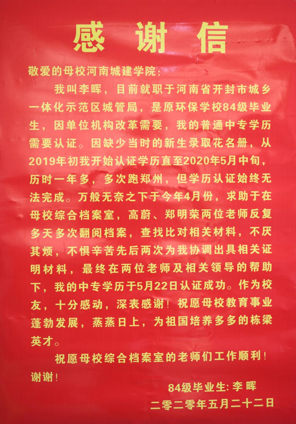 李晖,现就职于河南省开封市城乡一体化示范区城管局,是我校(原河南省平顶山城建环保学校)1984级学生,因单位机构改革需要,其普通中专学历需要认证。他本人自2019年初开始认证学历,历时一年多,多次辗转于郑州与开封之间,但因其学历认证缺乏关键性材料始终无法完成。今年4月份,他抱着试试的态度向我校综合档案室求助,由于正值疫情期间,工作人员通过QQ沟通,详细了解了他的具体情况,档案室的高蔚、郑明荣两位老师不辞辛苦,经过数天反复多次翻阅大量档案,认真比对存档材料和其本人提供的佐证材料,严格按照省教育厅关于中职学历认证的相关规定,先后两次为其出具相关证明材料,并及时为他快递过去,确保他的中专学历于5月22日得到认证成功。