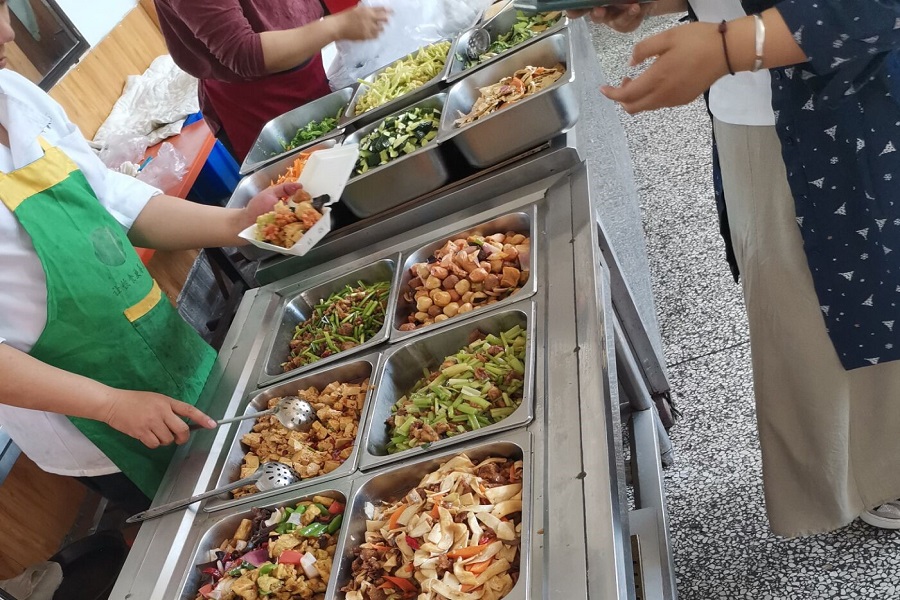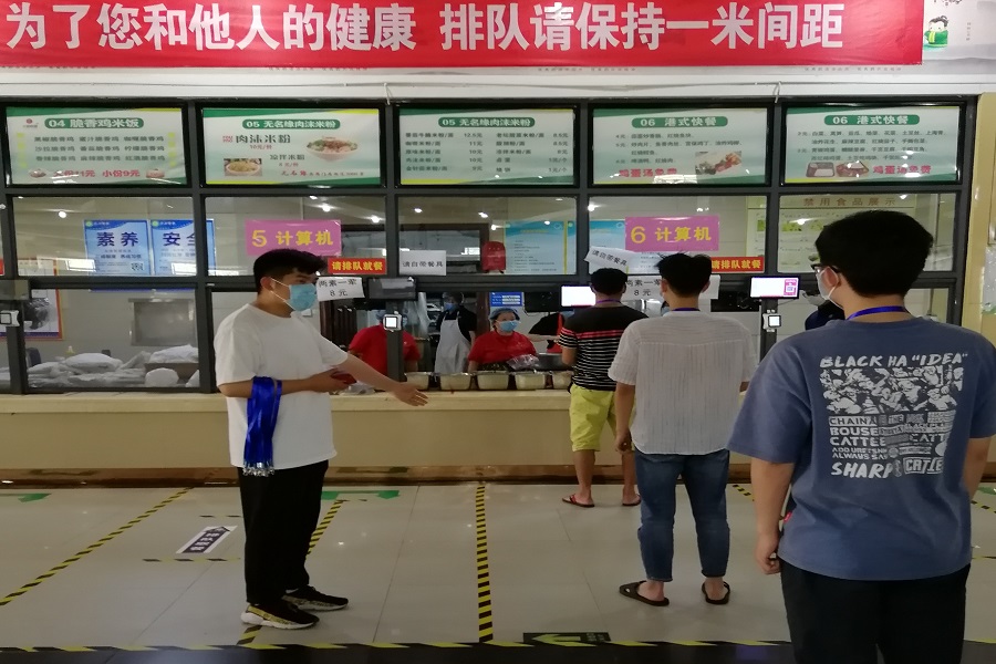 食堂就餐实行分餐制形式就餐,学生自备餐具,学生食堂提供AB两种套餐及卤面和饺子两种面食。学生按照学校为各学院划分的餐厅窗口及就餐区就餐,按照标识导线有序进入餐厅,间隔1米以上排队选餐。就餐时,先扫码,按照单人单桌同向就餐,有效避免就餐聚集。