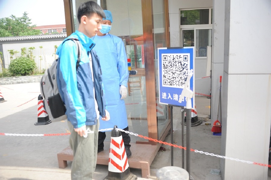 可是一些专业的学生不得不回校现场答辩,这个时候,教室活动时疫情防控十分重要,为此,学校建立网格化管理制度,在每栋教学楼门口设置了固定入口和出口标识;教学楼外入口处张贴本楼网格化管理一级网格长名单、疫情防控健康提示、设置分流引导设施和前后距离分隔标示线;教学楼内入口处,地面上根据不同分流路线设置分流路线方向标识;教室门口张贴各级网格长名单及联系方式,门前设置了距离间隔标示线,张贴了教室信息二维码,教室按单列隔排原则张贴了二维码及编号,学生依次有序按照导图和标识进入教室学习和答辩,并扫码填报个人信息。