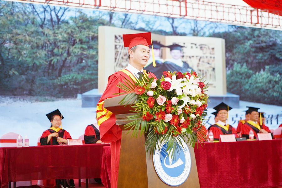 受疫情的影响,今年的毕业典礼采用了线上线下同步进行的方式举行。王召东用深情的话语与大家分享了城建里满满的青春诗歌,讲述了校园内一个个美丽蜕变的励志故事:有以实际行动展现了城建人的爱国情怀和担当精神的计算机与数据科学学院学院物联网工程专业毕业生阳世伟同学;有创新创业业绩突出,创立年营业额近30万元摄影工作室的测绘与城市空间信息学院测绘工程专业的李爱民;有团结拼搏、锐意进取、昂扬向上,12名同学全部考取研究生,来自土木与交通工程学院土木工程专业和测绘与城市空间信息学院地理信息科学专业“学霸”宿舍的同学们;有勤奋努力,刻苦钻研,持之以恒的市政与环境工程学院给排水专业余涵和法学院张炯;也有把自己最绚丽的青春,投身到火热的军营,为国防建设和强军目标贡献了智慧和力量的参军入伍学生。同时,王召东还向同学们分享了在全面抗疫这场战争中,我校的02届城市规划专业校友余流涛、03届房屋建筑工程专业校友张群锋等主动请缨,积极参与郑州版“小汤山”医院设计过程连续作战60个小时,终于圆满完成设计任务的先进事迹,以及我校92届给排水工程专业校友焦进农、15届电气工程及其自动化专业校友白跃兵在洛阳版“小汤山”医院建设中,连续奋战三个不眠之夜,按时将医院交付使用的感人故事。还有在学校疫情防控最艰难的时刻,挺身而出,为学校捐赠防控物资,默默地为学校疫情防控贡献力量的广大校友,他们在关心支持着母校发展,他们时刻为母校师生健康安全着想,通过实际行动为学校的疫情防控捐款捐物,共同奏响了“致母校,就是致青春”“母校加油”的最强音,用实际行动诠释了对母校深深的挚爱。王召东对2020届毕业生提出了殷切的期望和叮嘱:大学毕业,人生面临着新的选择,尤其是在全球疫情持续蔓延,经济下行风险加剧,不确定不稳定因素叠加的特殊时期,同学们面临的困难和挑战会显著增加,面对“骨感”的现实,希望你们多些理性、多些主见,坚定选择,恪守正道,勇敢面对生活中的风浪,领略最美的人生风景。