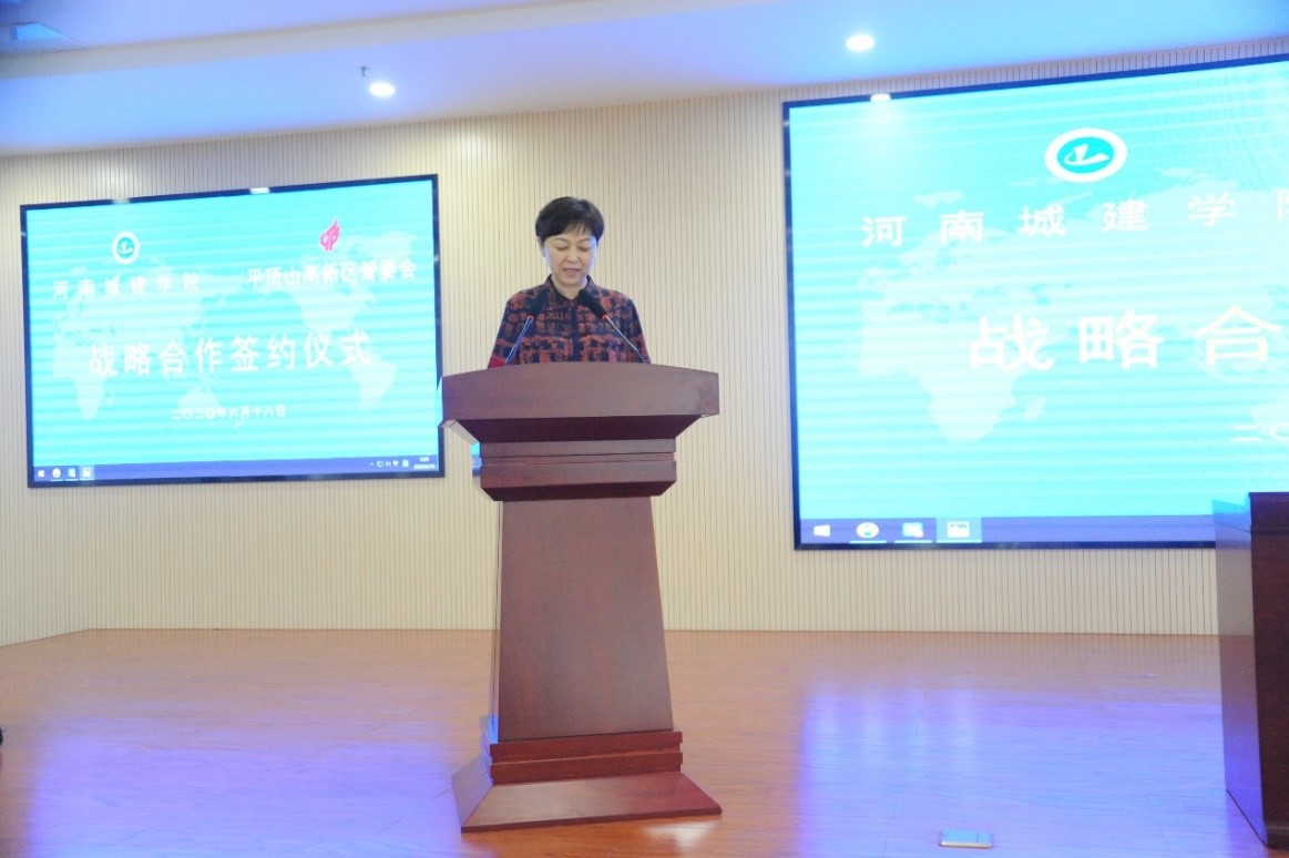 刘颖代表市政府对此次成功签约表示祝贺。她指出,河南城建学院与高新区的产学研合作高度契合当前改革发展的新形势,签约双方应切实找准切入点和突破口,进一步完善合作机制,不断深化、细化合作内容,强化配合联动机制,确保合作项目顺利推进、取得实效,不断在新的起点上推进高校与地方经济发展的深度融合。她表示,今后市政府将积极为双方合作搭建好服务平台,加强组织协调和政策保障,给予校地、校企合作更大的保障和支持。同时,她也期望河南城建学院在与高新区开展合作的基础上,能进一步与平顶山市开展全方位、更高层次的深入合作,为平顶山市产业转型升级和地方经济发展提供更多更强的智力支持和服务。