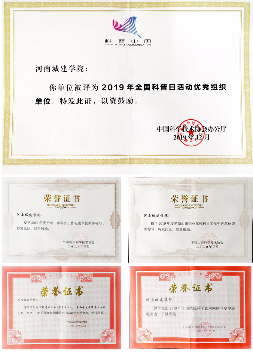 另悉,在科普教育工作中,我校还获得河南省科学技术协会2019年河南省全国科普日优秀工作者1项以及平顶山市科普工作先进单位、平顶山市企业高校科协工作先进单位和平顶山市企业高校科协工作先进工作者1项等相关荣誉。