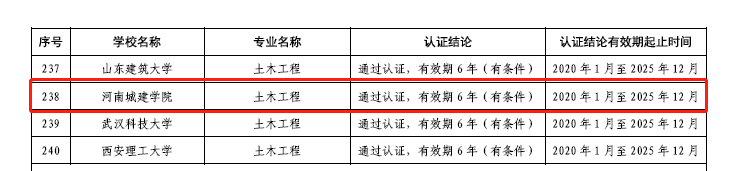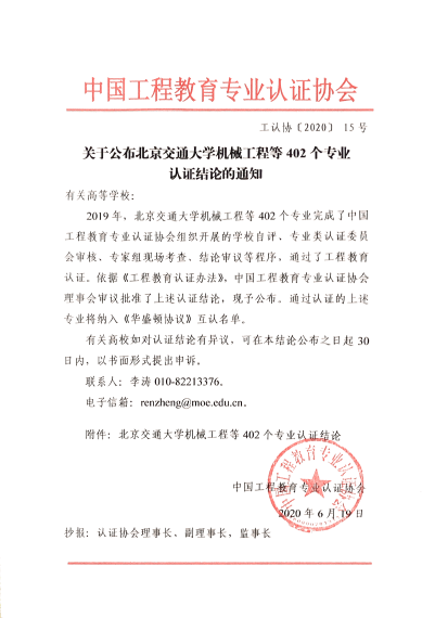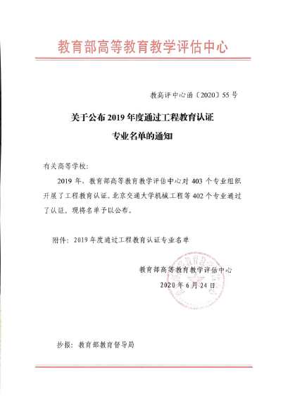 (通讯员 宋帅奇 陈怡璇)近日,教育部高等教育教学评估中心、中国工程教育专业认证协会正式发布《关于公布2019年度通过工程教育认证专业名单的通知》(教高平中心函[2020]55号)和《关于公布北京交通大学机械工程等402个专业认证结论的通知》(工认协[2020]15号),公布了2019年度通过工程教育认证专业名单,我校土木工程专业顺利通过工程教育专业认证,有效期6年(2020年1月至2025年12月)。