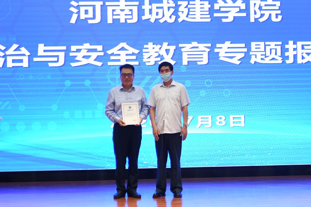(通讯员 许京生)7月9日下午,我校在行政楼学术报告厅举办法制与安全教育专题报告会,特邀上海交通大学韩长印教授做专题讲座,平顶山市维稳办主任陈满乐、市委政法委副书记王战胜和我校副校长宿金勇出席会议,学校全体中层干部参加会议。会议由校长办公室主任闫继涛主持。