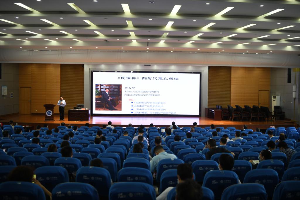 韩长印教授以《民法典的时代意义解读》为题,从《民法典》的历史沿革入手,对《民法典》的制订背景、立法宗旨、基本内容、修改亮点以及时代意义进行了详细解读,就如何引导师生学法、懂法、守法、用法,树立法治思维,捍卫法律权威,弘扬法治精神谈了自己思路和见解。