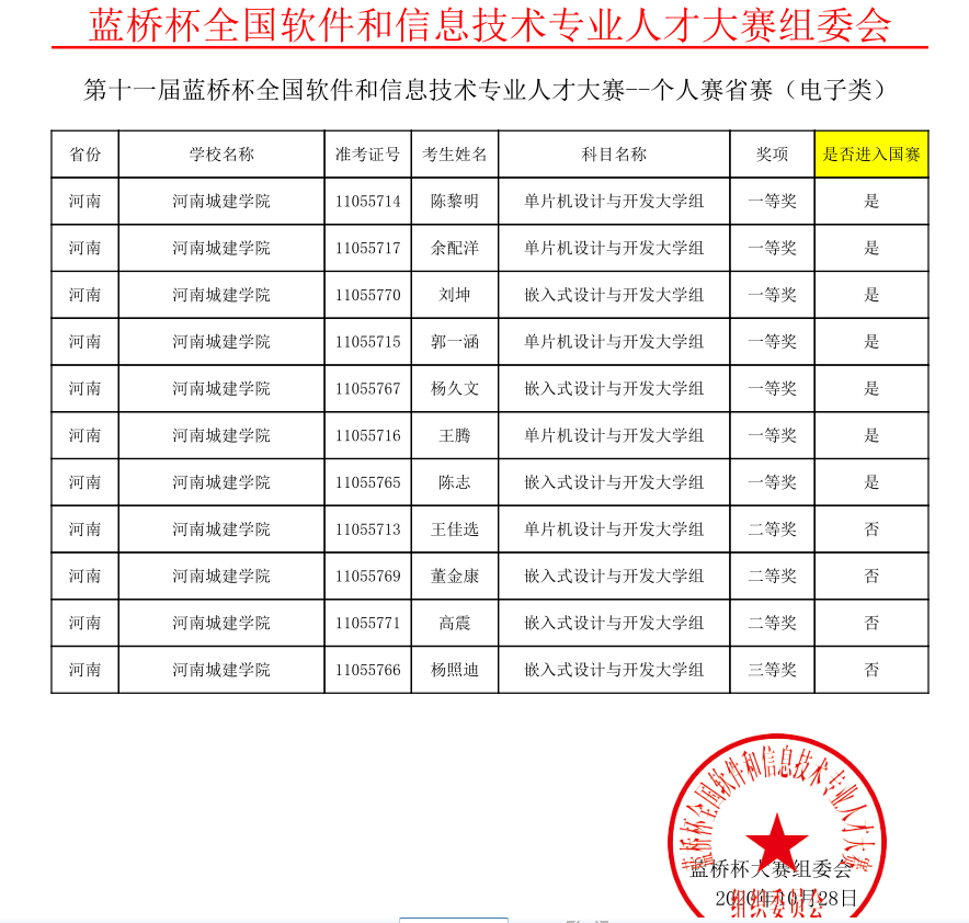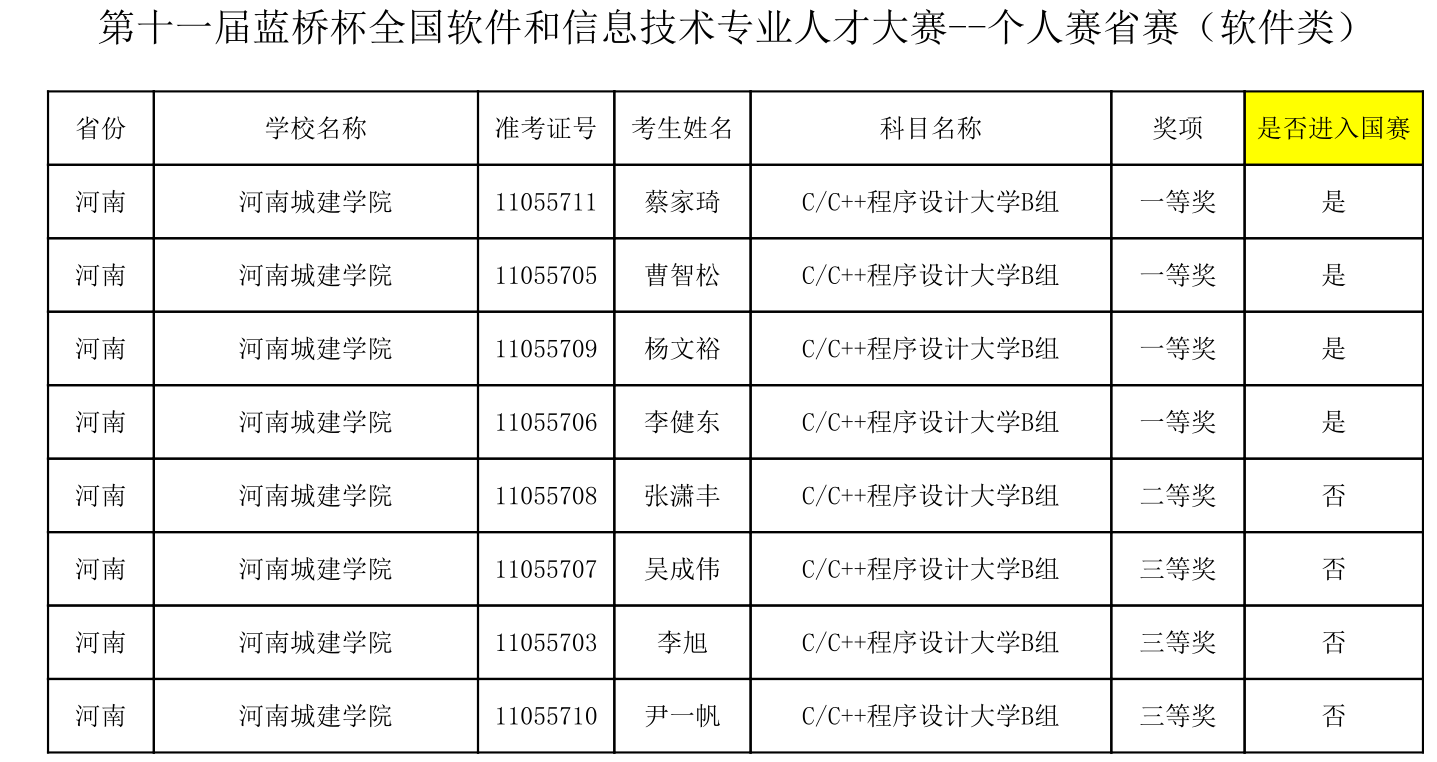 (通讯员 周岸 杜小杰)近日,由我校承办的第十一届“蓝桥杯”全国软件和信息技术专业人才河南赛区比赛竞赛结果出炉,我校学子再创佳绩。在本次比赛中,来自郑州大学、河南大学、河南师范大学、河南理工大学等全省50多所高校的3500余名选手同台竞技。由于疫情原因,今年的赛点设在各大参赛院校,比赛项目涵盖C/C++程序设计、JAVA软件开发、单片机设计与开发、嵌入式设计与开发等四大竞赛科目。