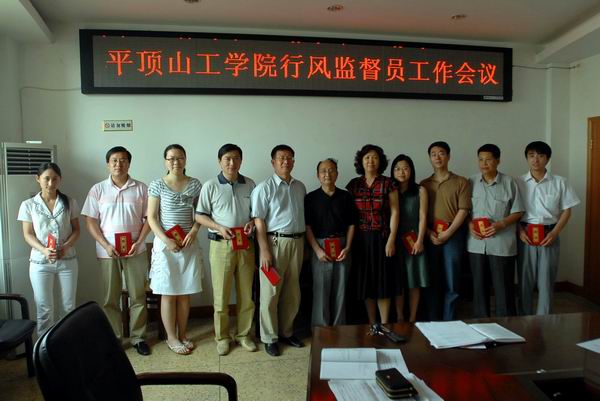 会上,纪委副书记兼监察室主任张平生宣读了《平顶山工学院行风监督员工作职责》、《平顶山工学院行风监督员例会制度》以及行风监督员名单。在随后举行的聘任仪式上,张莉蓉书记亲自为我院首批被聘任的每一位行风监督员颁发了聘书。手持饱含责任与信任的红色聘书,院系领导、人大代表、政协委员、教授、博士、老干部、中青年教师和学生等全院各界代表的行风监督员,就如何做好学校的行风评议工作进行了座谈。在座谈中大家一致表示,要珍惜这个机会,不辜负院党委和广大师生的信任与重托,要实事求是地收集和反映问题,为我院在校风、教风、学风方面建设得更好,使学院各项事业向更加规范的方向发展贡献自己的一份力量。最后,张莉蓉书记作讲话。
