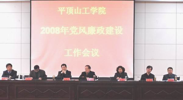 会上由党委副书记史战芳传达中央、省、市纪委会议主要精神;党委副书记张莉蓉安排部署了平顶山工学院2008年党风廉政建设和反腐败工作;签订《平顶山工学院党风廉政建设目标责任书》;最后院党委书记李德平同志作了《关于进一步加强我院党风廉政建设和反腐败工作》的重要讲话。