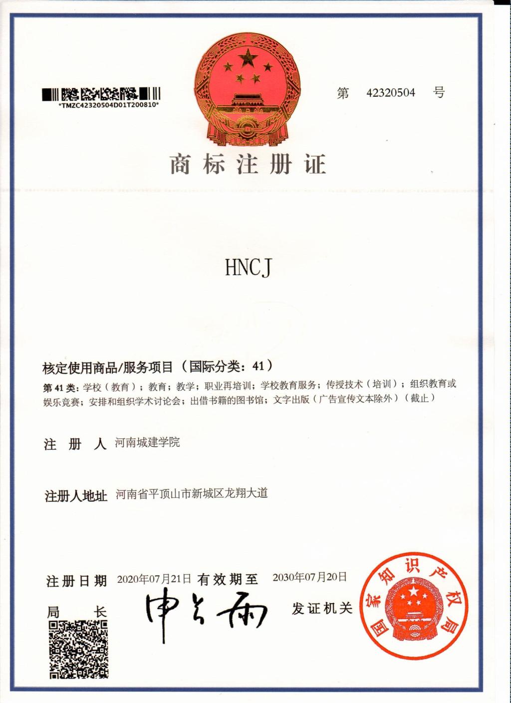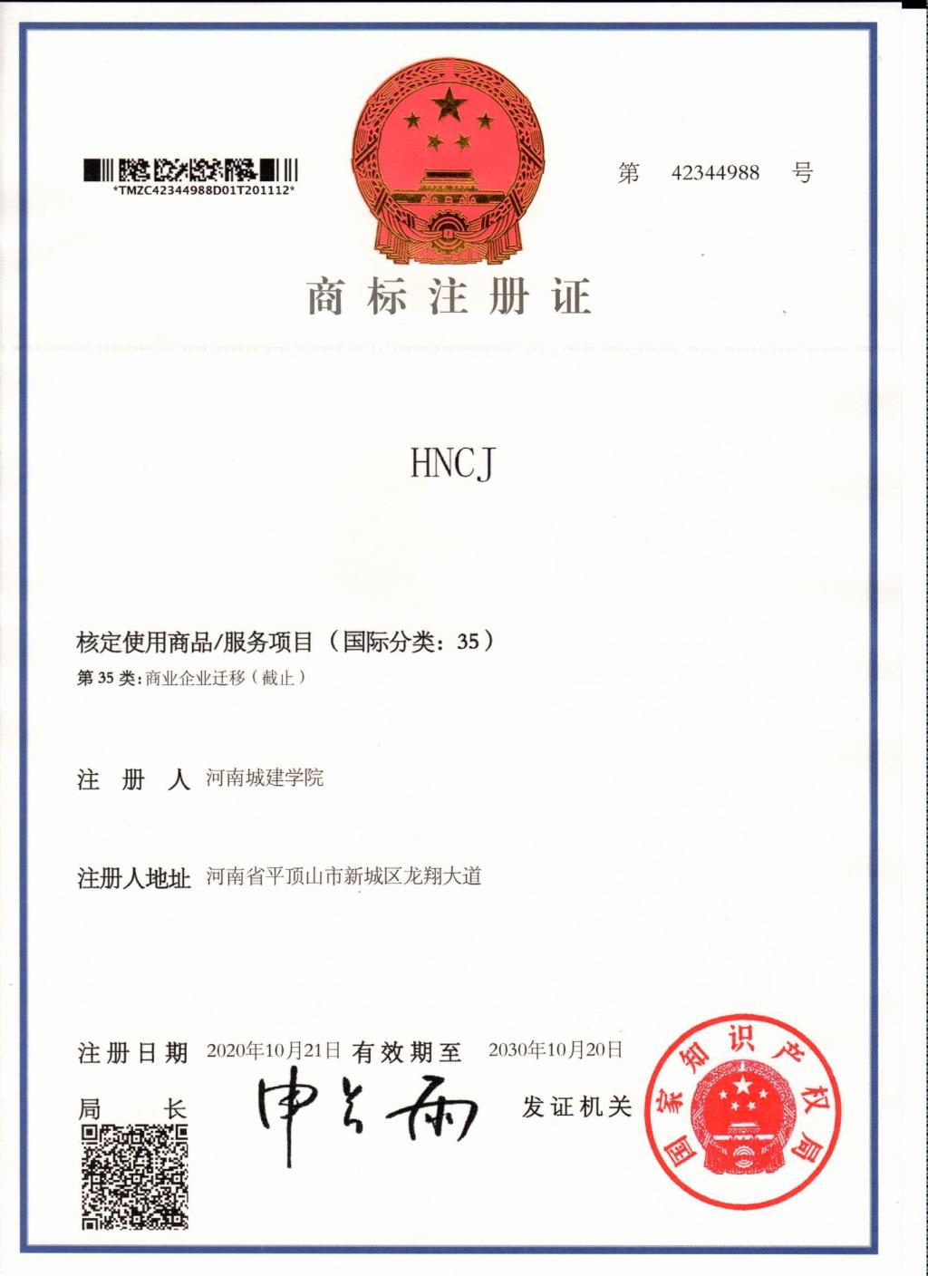 (通讯员 赵赛)近日,由资产公司代表学校提出申请,经国家知识产权局审核,我校申请的校名“河南城建学院”和缩写“HNCJ”两项商标获得国家知识产权局批准注册,并获发商标注册证。