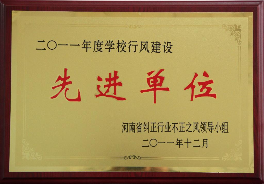 根据豫纠组[2011]14号《河南省纠正行业不正之风领导小组关于表彰2011年度学校行风建设先进单位的决定》,我校受到表彰,被省纠正行业不正之风领导小组评为2011年度学校行风建设先进单位。