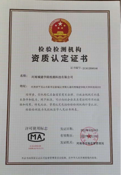 为了充分发挥实验室资源优势,提高设备利用率,实现国有资产保值增值,规范开展社会服务,我校于2019年10月组建了河南城建学院检测科技有限公司(以下简称“检测公司”)。相关部门及学院完成了实验室人员队伍的组建、仪器设备的使用培训、计量检定、实验室管理体系和软硬件设施建设、资质认定申报等系列工作。2021年3月,由省、市市场监督管理部门对检测公司进行了CMA资质认证现场评审、书面审查、听取汇报、查阅档案、审查体系文件、座谈和现场盲样抽测等方式的全面评审。通过整改、审核、专家复核等多个环节后,检测公司于2021年5月18日获得检验检测机构资质认定证书(CMA认证),获得涉及水和土壤两个大类88项参数的检验检测资质。