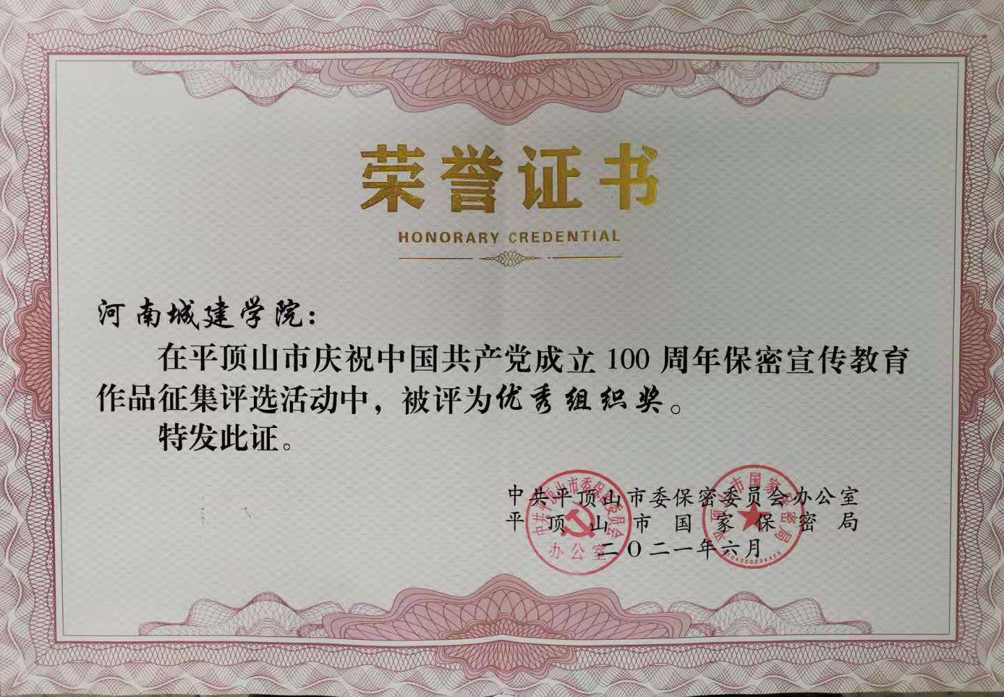 (通讯员 李熙利)为庆祝中国共产党成立100周年,继承和弘扬党的保密工作优良传统,平顶山市委保密办、平顶山市国家保密局在全市组织开展了庆祝中国共产党成立100周年保密宣传教育作品征集评选活动,我校选送的三幅书法作品在此次活动中均获得奖励,其中,我校杜留记老师书法作品《谨言之 慎行之》荣获二等奖,卢华东老师书法作品《周易·系辞上》节选和郑化浦老师硬笔书法作品《入党誓词》均获三等奖,学校被评为优秀组织奖。